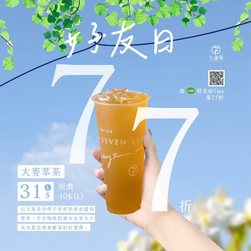 7月好友日品項出爐啦! 恭喜由我們 #大麥萃茶 得獎🎉 ➤ 𝟎𝟕/𝟎𝟕(日) 大麥萃茶 來店大杯限定優惠價 ❙ $40 ▸ $31 大麥+決明子培煎熬煮出溫和麥香, 每口都是古早回憶, 炎炎夏日清爽解渴的好選擇。 👉七編推薦 微糖少冰! 📣優惠僅限好友日當天! ------------------------------------- ✨立即加 𝐋𝐈𝐍𝐄 享優惠 >>https://reurl.cc/En2AX1 ------------------------------------- 活動詳情: ➊此活動全省門市皆適用。 ➋門市出示LINE好友日畫面即可。 ➌活動不得與其他優惠合併使用,環保杯折扣除外。 ➍活動僅限於現場消費,不適用於線上點餐、門市外送、第三方外送平台和電話預約。 #有事沒事七盞茶 #以茶佐日子 #好友日 #LINE #麥茶 #無咖啡因 #夏天 #清涼 #消暑 #7日好友日